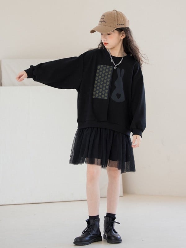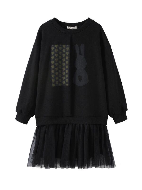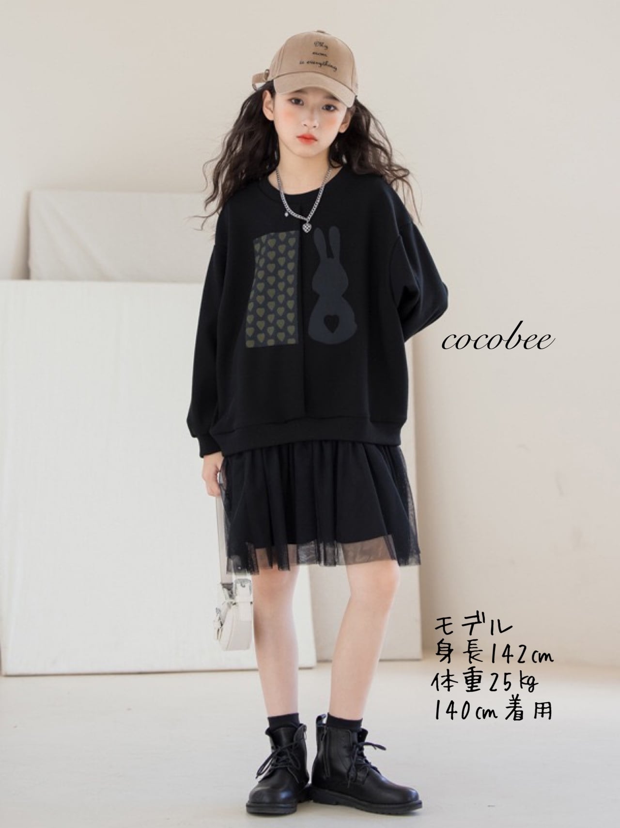 ゆったりとしたブラックのスウェットトップスに、軽やかなチュールスカートをドッキングした一枚で、動きのあるシルエットが魅力。