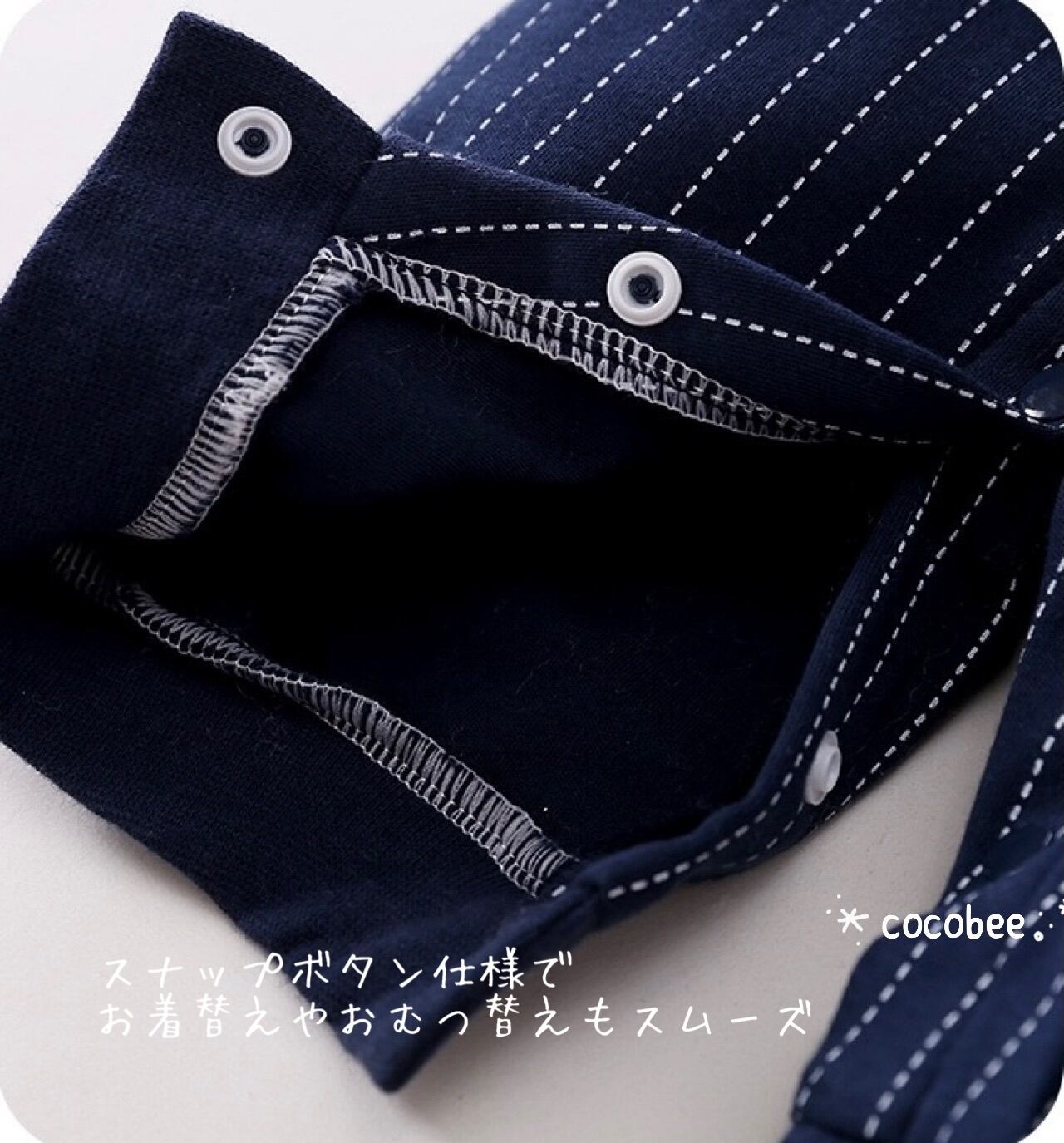 股下はスナップボタン付きで、おむつ替えもラクラク。
